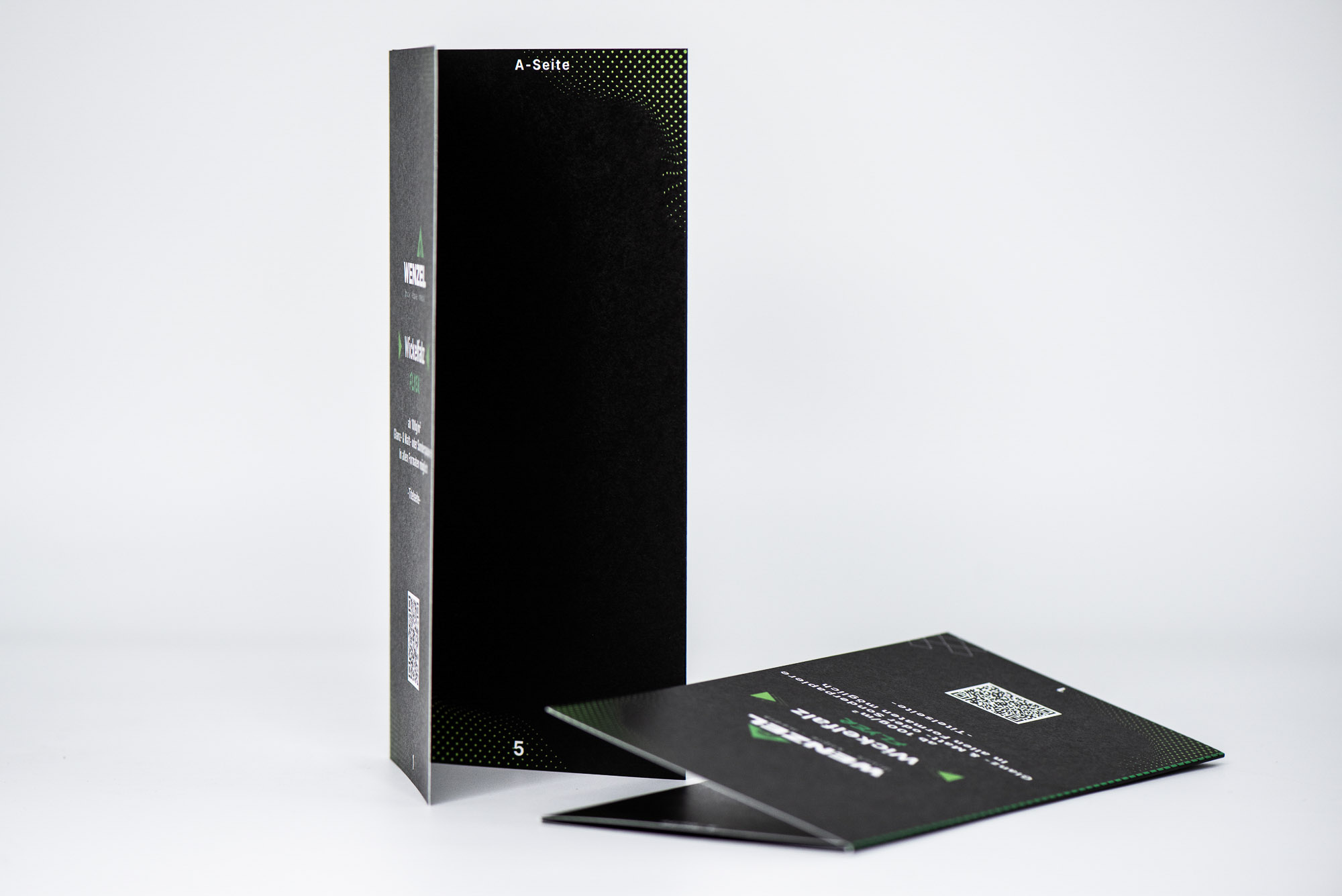Der Wickelfalz Flyer ist eine besonders beliebte Falzart, bei der der Druckbogen zwei- oder mehrmals in dieselbe Richtung gefalzt wird. Die charakteristische Bezeichnung „Wickelfalz“ entsteht dadurch, dass sich die Seiten buchstäblich um die innerste Seite herumwickeln. Beim Aufklappen entfalten sich die Inhalte Seite für Seite in einer logischen Reihenfolge und schaffen eine natürliche Leseführung.